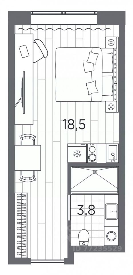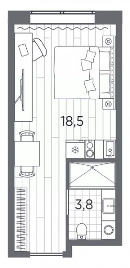 Однокомнатные апартаменты-студия с отделкой в ЖК "Industrial AVENIR" на 3 этаже. Общая площадь: 22.3 кв.м., площадь гостиной 18.5 кв.м., из которых 5 кв.м. выделено под кухонную зону. Все окна выходят на одну сторону. В апартаментах один совмещенный санузел. Высота потолков 2.5 м.