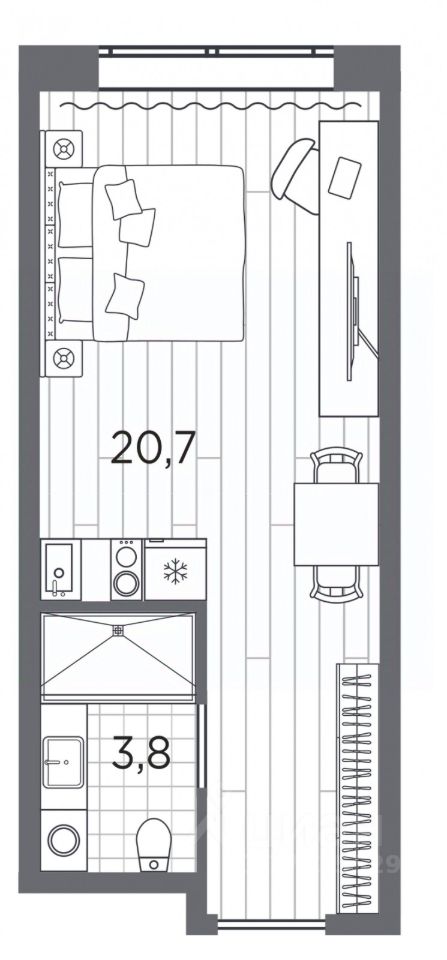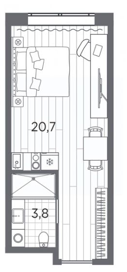 Просторные однокомнатные апартаменты-студия с отделкой в ЖК "Industrial AVENIR" на 3 этаже. Общая площадь: 24.5 кв.м., площадь гостиной 20.7 кв.м., из которых 5 кв.м. выделено под кухонную зону. Все окна выходят на одну сторону. В апартаментах один совмещенный санузел. Высота потолков 2.5 м.
