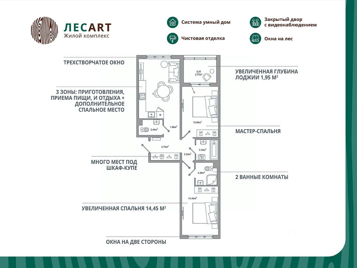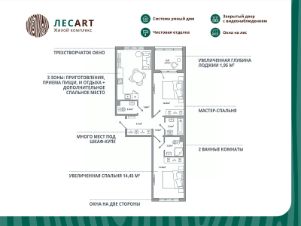 Продаётся 2-комнатная квартира 137, общей площадью 64.73 кв.м., на 11. Дом комфорт-класса, 12 этажей, в окружении леса и малоэтажной застройки. Проект с умным домом. Передача квартир в апреле 2026г.