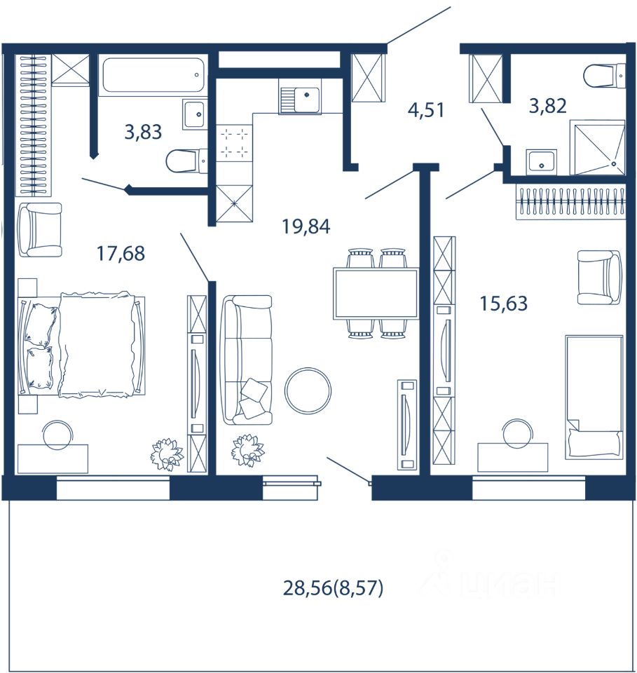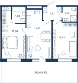Апартамент 378 площадью 73,88 кв.м. в корпусе Aqua с видом во двор