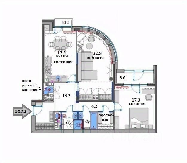 Кухня-гостиная 15.5 кв.м., комнаты 22.8 и 17.3 кв.м.,