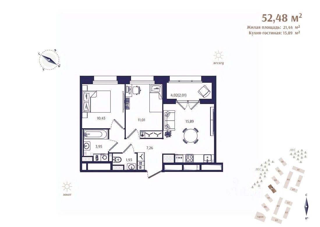 Общая площадь52,48 м²