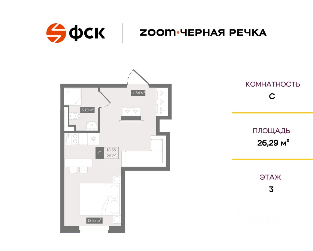 Цена со специальной скидкой в прямой продаже от застройщика — только в этом месяце. Апартамент-студия в комплексе класса бизнес-лайт Zoom Чёрная Речка на 3-м этаже. Общая площадь 26,29. Чистовая отделка.