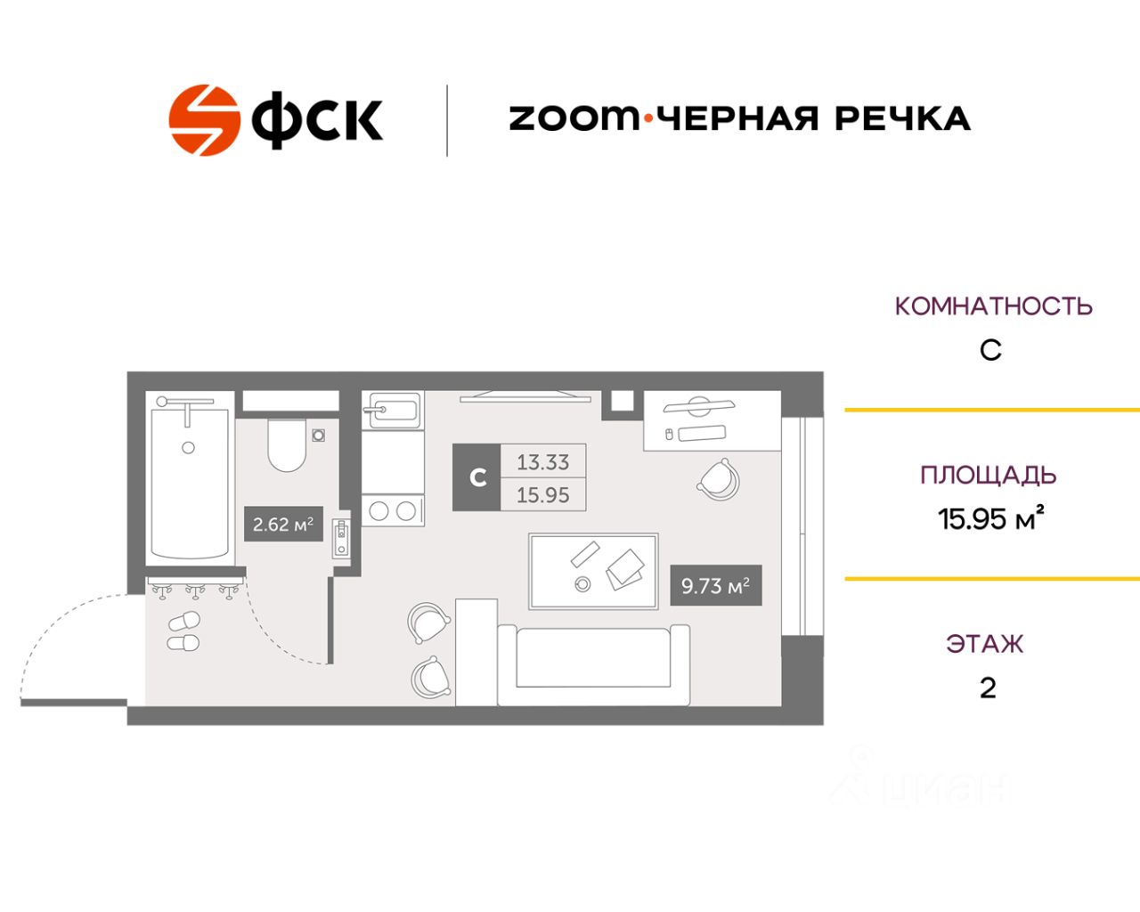 Общая площадь15,95 м²