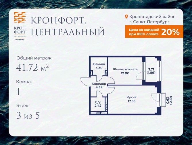 Стоимость квартиры указана со скидкой 20%. Скидка предоставляется при 100% оплате или несубсидированной ипотеке.