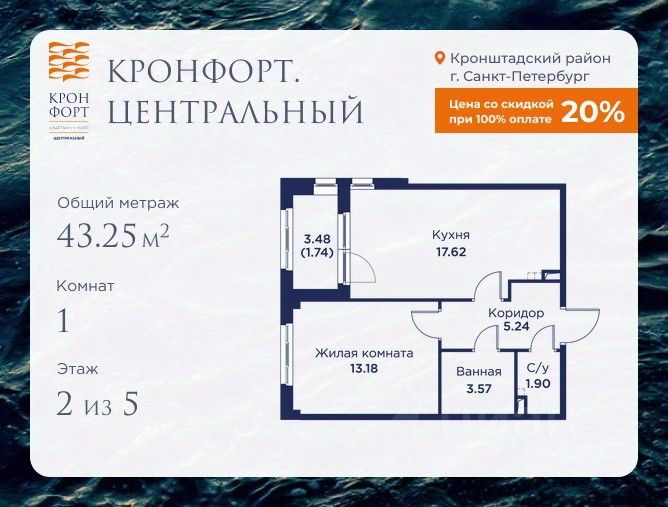 Стоимость квартиры указана со скидкой 20%. Скидка предоставляется при 100% оплате или несубсидированной ипотеке.