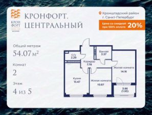 Предлагается квартира площадью 54.07 кв.м в жилом комплексе "Кронфорт. Центральный" в Санкт-Петербурге (Кронштадт). Возможна покупка с использованием льготных и специальных ипотечных программ с государственной поддержкой.