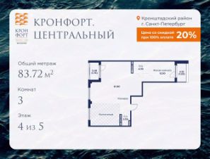 Предлагается квартира площадью 83.72 кв.м в жилом комплексе "Кронфорт. Центральный" в Санкт-Петербурге (Кронштадт). Возможна покупка с использованием льготных и специальных ипотечных программ с государственной поддержкой.
