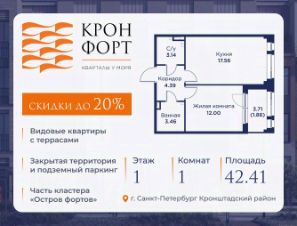 Стоимость квартиры указана со скидкой 20%. Скидка предоставляется при 100% оплате или несубсидированной ипотеке. Предлагается квартира площадью 42.41 кв.м в жилом комплексе "Кронфорт. Центральный" в Санкт-Петербурге (Кронштадт). Возможна покупка с использованием льготных и специальных ипотечных программ с государственной поддержкой. Высота потолков в квартирах — от 3 до 3,4 метров, окна увеличенного размера, есть варианты с эркерами, французскими балконами, лоджиями и террасами. Жилой квартал состоит из пяти четырехэтажных корпусов с закрытыми охраняемыми дворами, свободными от машин. Первые этажи формируют торговые променады в стиле пешеходных улиц исторической части Петербурга и Кронштадта. Внутренние пространства между корпусами — пешеходные зоны с уютными площадями. Архитектурный облик квартала разработан бюро "Проектная культура" и международной компанией Chapman Taylor. Инфраструктура комплекса включает: - Лицей с двумя бассейнами - Детский сад на 150 мест с бассейном и закрытой территорией - Веревочный парк - Игровые площадки для активного отдыха; - Кабинет врача общей практики. - Подземные паркинги с лифтами. - Мусоросборные камеры, индивидуальные кладовые. - Закрытые дворы с контролем доступа и видеонаблюдением. - Мультформатный стрит-ретейл с кафе и ресторанами. - Триатлон-центр и беговые/велодорожки. - Учебно-тренировочный комплекс для детей "Лагерь настоящих героев". Транспортная доступность обеспечивает удобный выезд на КАД (около 1-3 км), 2 минуты пешком до автобусной остановки "Лицей", 25 минут до Сестрорецка, 30 минут до "Лахта-центра", 50 минут до аэропорта "Пулково" и 60 минут до Московского вокзала. Для любителей моря доступен маршрут на "Метеоре" до центра Санкт-Петербурга. Отделка квартир предлагается как с готовой чистовой отделкой, так и со свободной планировкой без отделки для реализации индивидуальных дизайнерских решений. В третьем корпусе, продажи которого стартовали в марте 2025 года, доступны квартиры с просторными террасами, тремя балконами, кухнями-гостиными до 38 кв.м с окнами на две стороны, обеспечивающими панорамное освещение и виды. Если вам нужна помощь с оформлением ипотеки или дополнительная информация по комплексу и условиям покупки, обращайтесь в отдел продаж за консультацией.