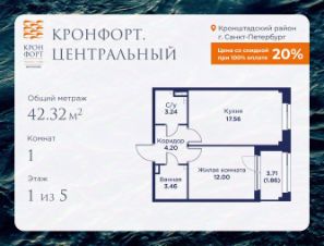 Предлагается квартира площадью 42.32 кв.м в жилом комплексе "Кронфорт. Центральный" в Санкт-Петербурге (Кронштадт). Возможна покупка с использованием льготных и специальных ипотечных программ с государственной поддержкой.