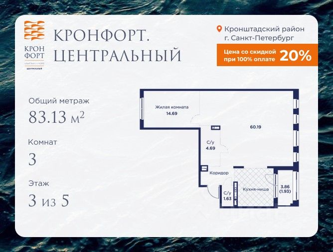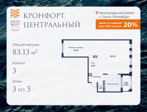 Предлагается квартира площадью 83.13 кв.м в жилом комплексе "Кронфорт. Центральный" в Санкт-Петербурге (Кронштадт). Возможна покупка с использованием льготных и специальных ипотечных программ с государственной поддержкой.