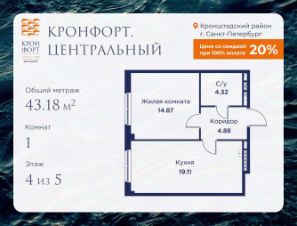 Предлагается квартира площадью 43.18 кв.м в жилом комплексе "Кронфорт. Центральный" в Санкт-Петербурге (Кронштадт). Возможна покупка с использованием льготных и специальных ипотечных программ с государственной поддержкой.