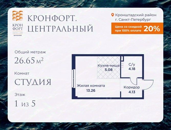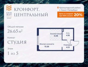Предлагается квартира площадью 26.65 кв.м в жилом комплексе "Кронфорт. Центральный" в Санкт-Петербурге (Кронштадт). Возможна покупка с использованием льготных и специальных ипотечных программ с государственной поддержкой.