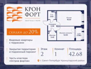 Предлагается квартира площадью 42.68 кв.м в жилом комплексе "Кронфорт. Центральный" в Санкт-Петербурге (Кронштадт). Возможна покупка с использованием льготных и специальных ипотечных программ с государственной поддержкой.