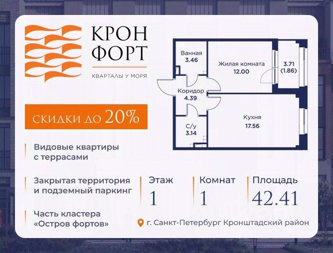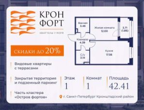 Предлагается квартира площадью 42.41 кв.м в жилом комплексе "Кронфорт. Центральный" в Санкт-Петербурге (Кронштадт). Возможна покупка с использованием льготных и специальных ипотечных программ с государственной поддержкой.