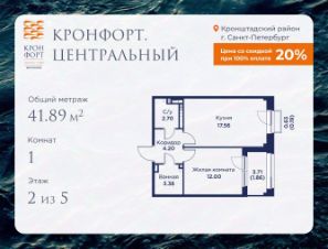 Предлагается квартира площадью 41.89 кв.м в жилом комплексе "Кронфорт. Центральный" в Санкт-Петербурге (Кронштадт). Возможна покупка с использованием льготных и специальных ипотечных программ с государственной поддержкой.