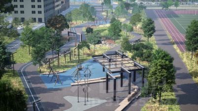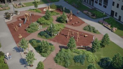 Здесь вы найдете полноценное место для отдыха и мероприятий с ярусными скамейками и большой елью, несколько детских площадок и спортивный кластер с баскетбольной и волейбольной площадками, воркауттренажерами и лужайкой для йоги. Паркбульвар станет настоящим хабом для пешеходов — дорожки к популярным точкам инфраструктуры будут переплетаться с основной транзитной дорогой с асфальтовым и набивным покрытием, по которой будет удобно идти, бежать или ехать на самокате.