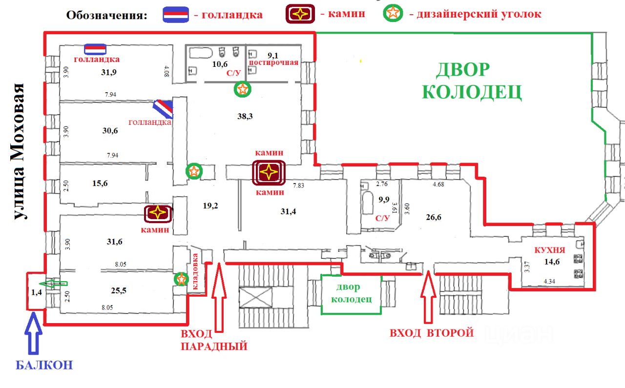 Квартира имеет два входа: парадный, с фасада, для торжественных встреч, и укромный черный ход со двора, хранящий секреты. В доме установлена система видеонаблюдения, а лифт плавно доставит вас на нужный этаж.