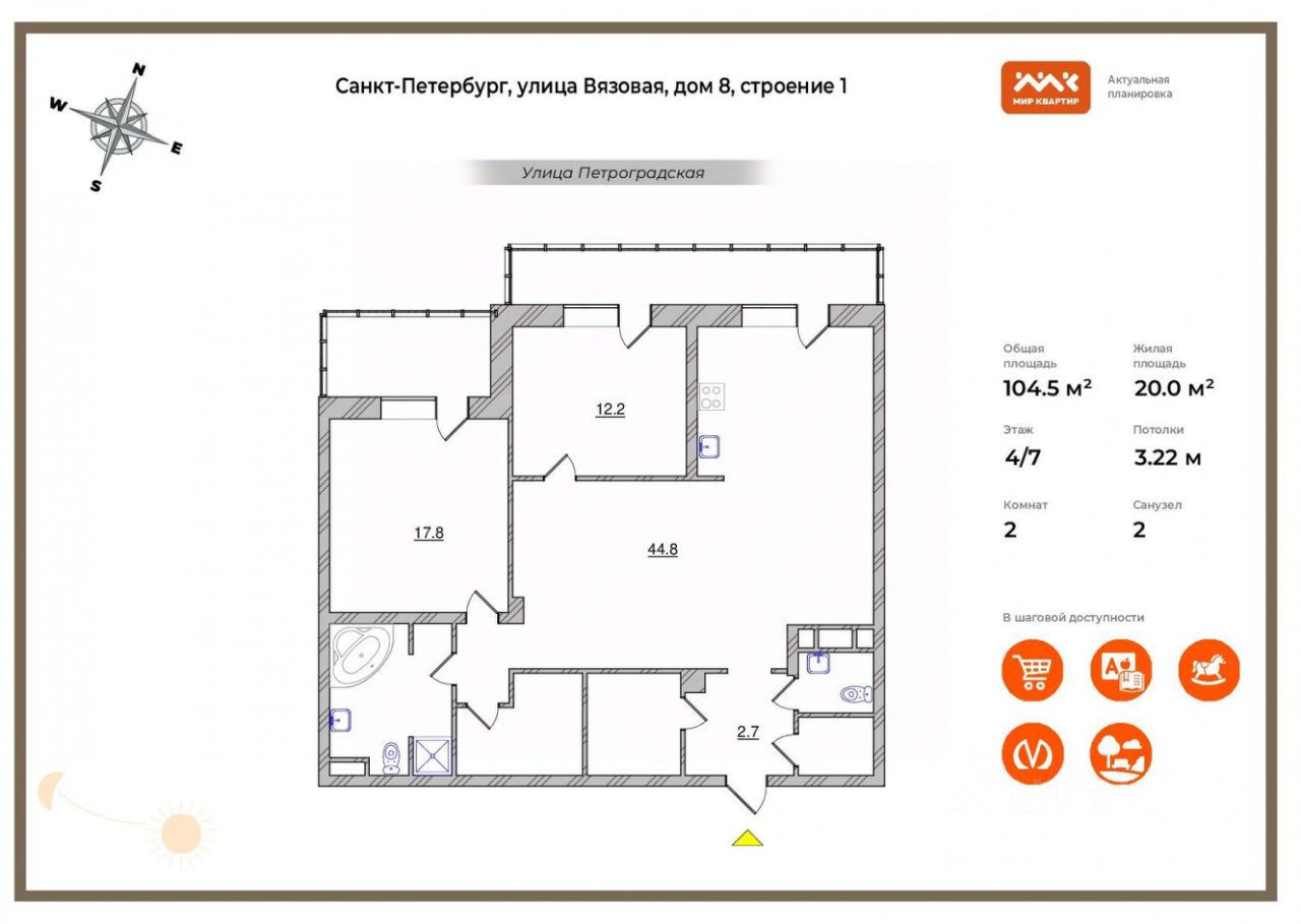 Продаётся 3 комнатная квартира. Общая площадь 104,5 кв.м Две спальни 17+13 кв.м. гостиная и кухня с мебелью и техникой премиум класса, две гардеробные, кладовая и два санузла.