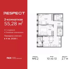 Двухкомнатная квартира от застройщика с отделкой в ЖК "RESPECT" на 10 этаже. Общая площадь: 55.28 кв.м., жилая: 26.15 кв.м., площадь просторной кухни-столовой: 15.49 кв.м. Комнаты изолированные, все окна выходят на одну сторону. В квартире одна лоджия, один совмещенный и один раздельный санузел. Высота потолков 2.7 м.