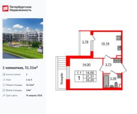 Удобная, классическая планировка, кухня 10.19 м², вместительная прихожая 3.73 м². Общая площадь квартиры - 31.31 м², жилая 14 м², высота потолка 2.77 м.