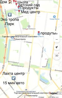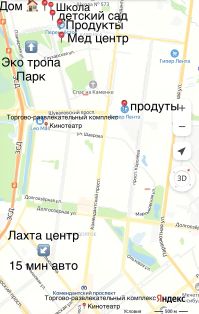 Развитая инфраструктура - детские и медицинские учреждения, магазины, пекарни, все в шаговой доступности. Городской парк с экотропой. Лахта центр.