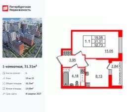 Удобная, классическая планировка, кухня 8.13 м², вместительная прихожая 3.95 м². Общая площадь квартиры - 31.31 м², жилая 15.05 м², высота потолка 2.77 м.