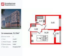 Удобная, классическая, функциональная европланировка, большая кухня-гостиная 14.29 м², просторная прихожая 4.48 м². Общая площадь квартиры - 31.59 м², жилая 9.45 м², высота потолка 2.77 м.