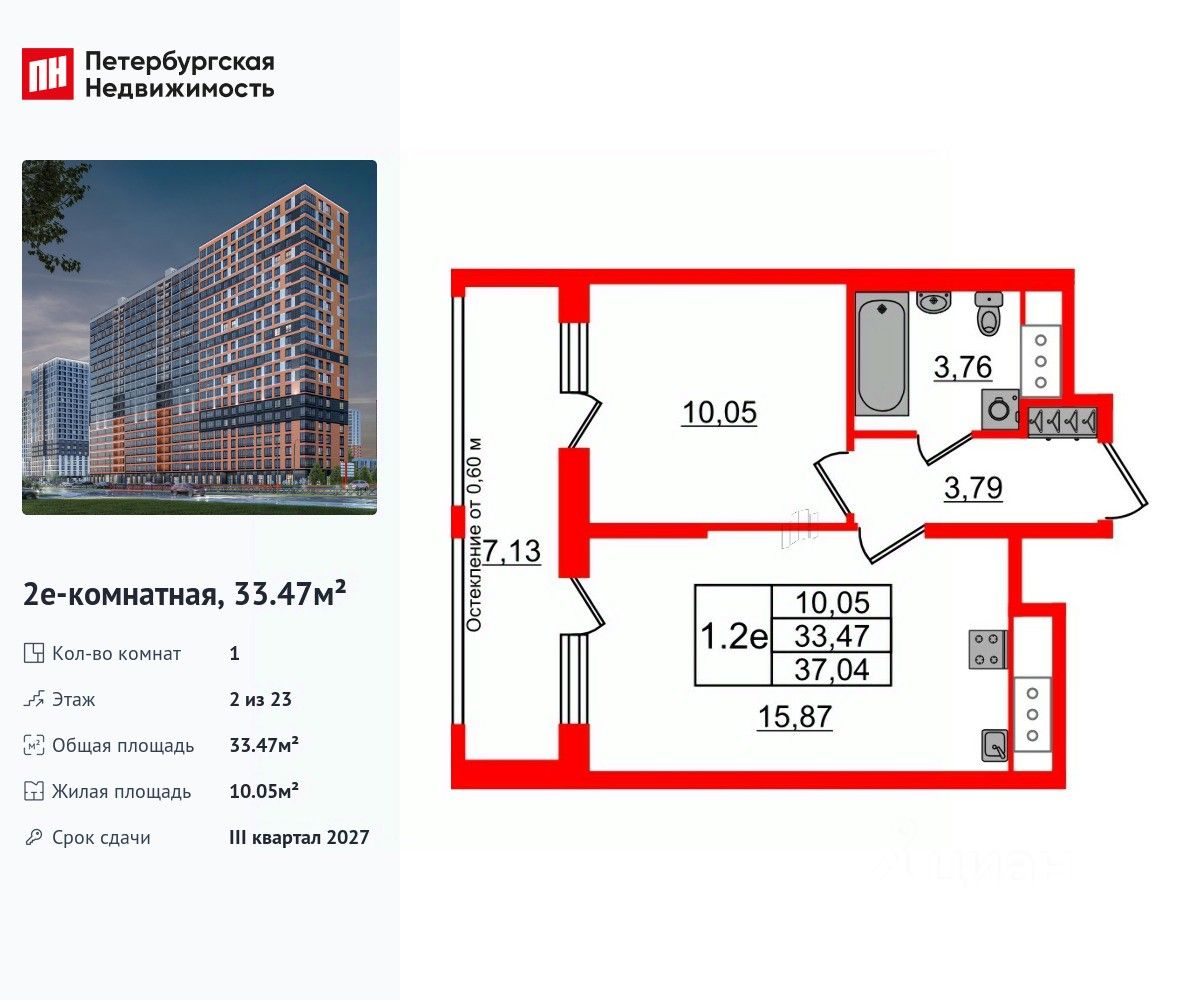 Удобная, классическая, функциональная европланировка, большая кухня-гостиная 15.87 м², вместительная прихожая 3.79 м². Общая площадь квартиры - 33.47 м², жилая 10.05 м², высота потолка 2.77 м.