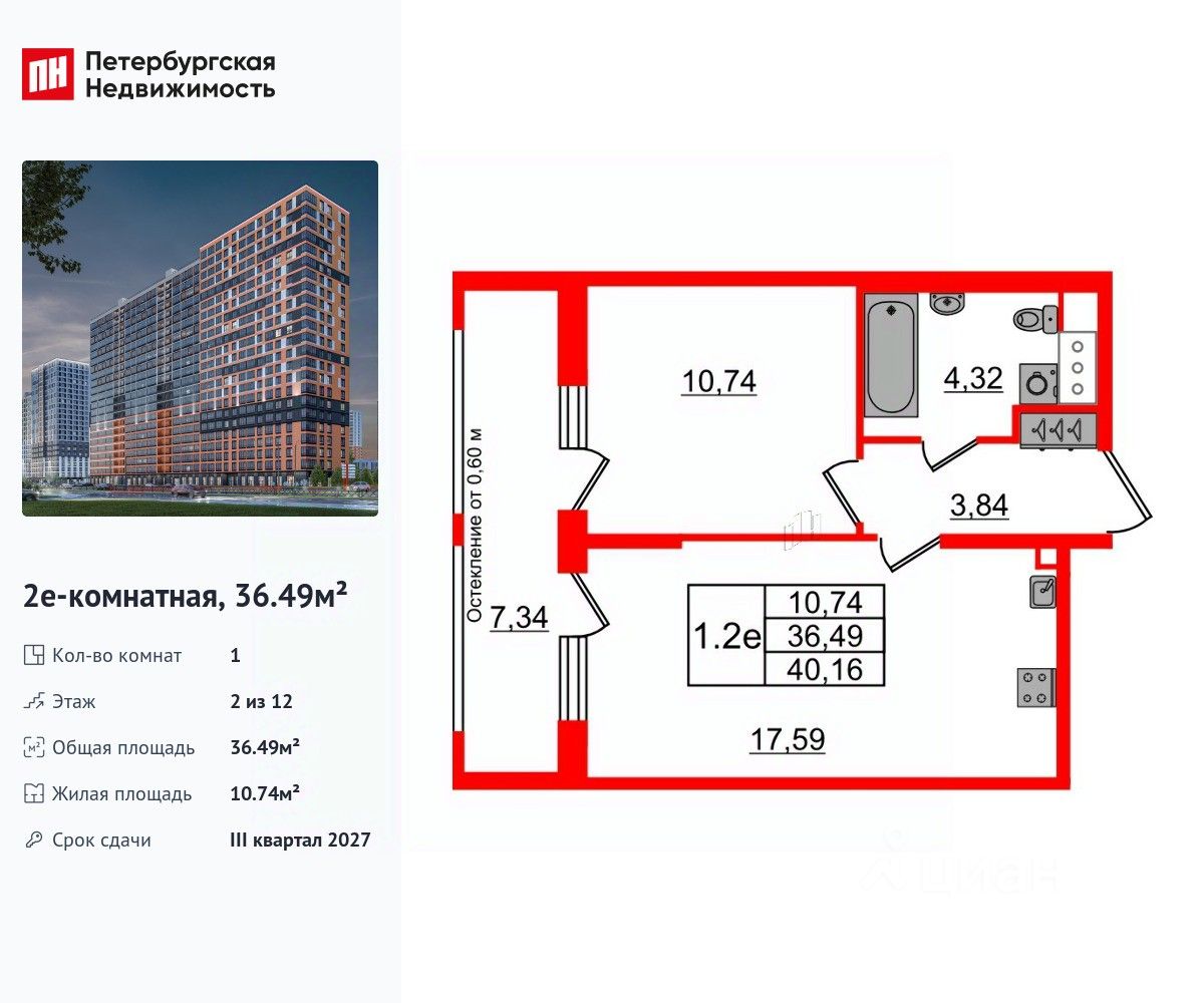 Удобная, классическая, функциональная европланировка, большая кухня-гостиная 17.59 м², вместительная прихожая 3.84 м². Общая площадь квартиры - 36.49 м², жилая 10.74 м², высота потолка 2.77 м.