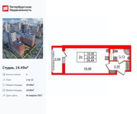 Удобная, классическая, функциональная европланировка, просторная прихожая 3.3 м². Общая площадь студии - 24.49 м², жилая 18.06 м², высота потолка 2.77 м.