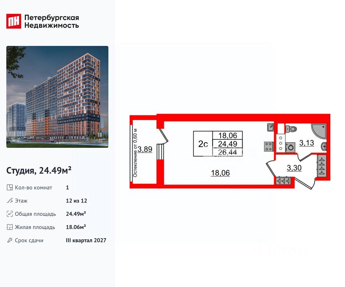 Удобная, классическая, функциональная европланировка, просторная прихожая 3.3 м². Общая площадь студии - 24.49 м², жилая 18.06 м², высота потолка 3 м.