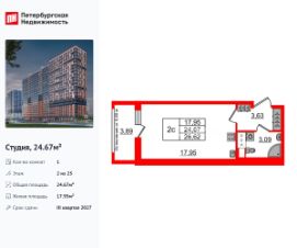 Удобная, классическая, функциональная европланировка, просторная прихожая 3.63 м². Общая площадь студии - 24.67 м², жилая 17.95 м², высота потолка 2.77 м.