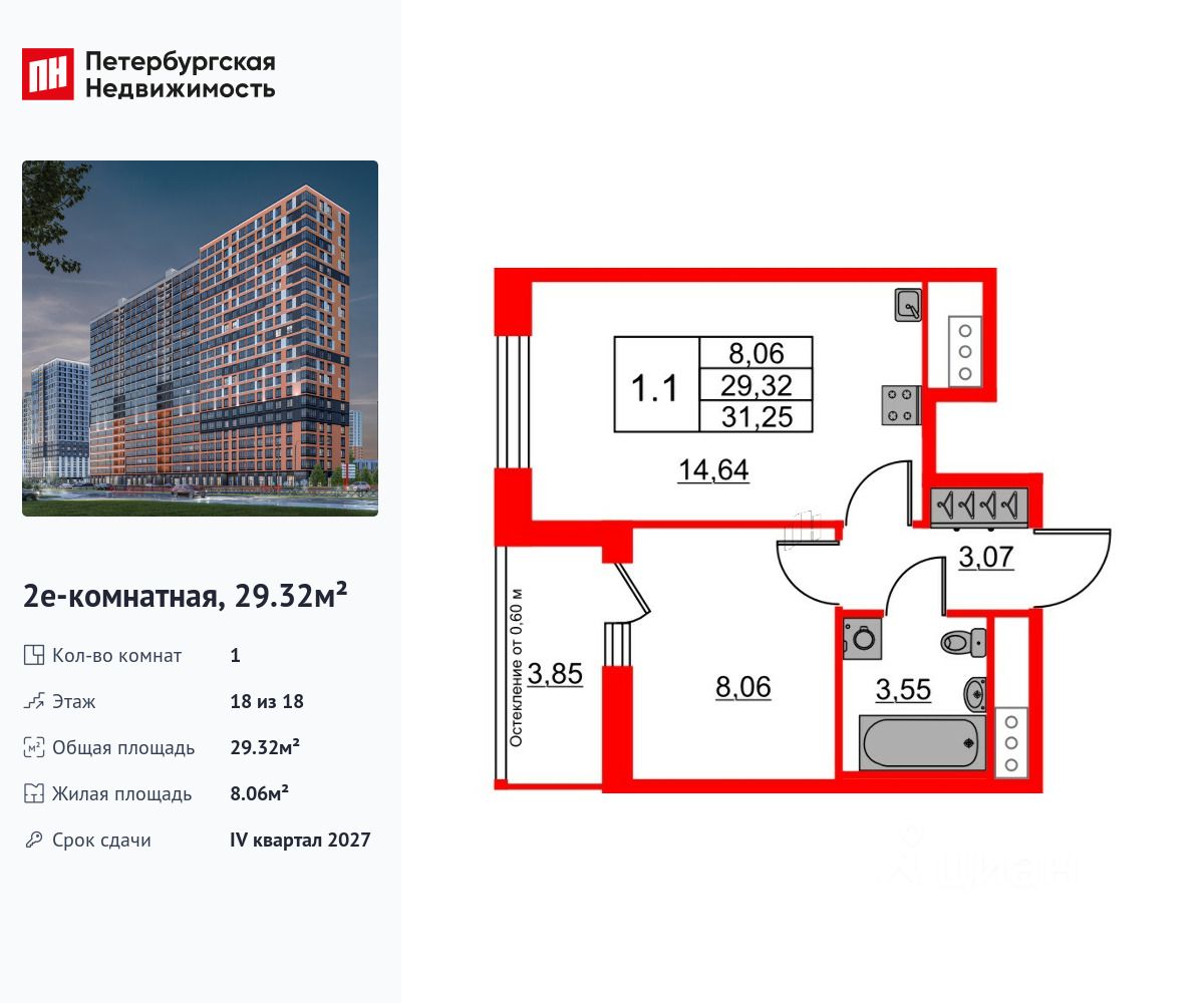 Удобная, классическая, функциональная европланировка, большая кухня-гостиная 14.64 м², вместительная прихожая 3.07 м². Общая площадь квартиры - 29.32 м², жилая 8.06 м², высота потолка 3 м.