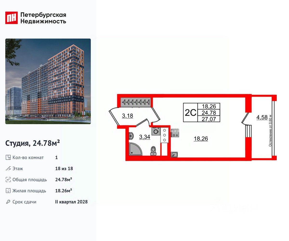 Удобная, классическая, функциональная европланировка, вместительная прихожая 3.18 м². Общая площадь студии - 24.78 м², жилая 18.26 м², высота потолка 3 м.