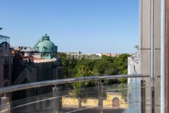 Квартира включает просторныи холл, кухню-столовую, гостинную, три спальни, кабинет, две гардеробные, две ванные комнаты и гостевой санузел. Уникальная особенность квартиры — это панорамные виды на Смольныи собор и Таврическии сад.