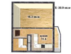 Общая площадь квартиры 30.9 кв. м., комната 16.3 кв. м., кухня 9 (по документам кухня 11.5, но включает в себя коридор т.к. нет двери между прихожей и кухней, фактически кухня - квадрат 3 на 3 метра.