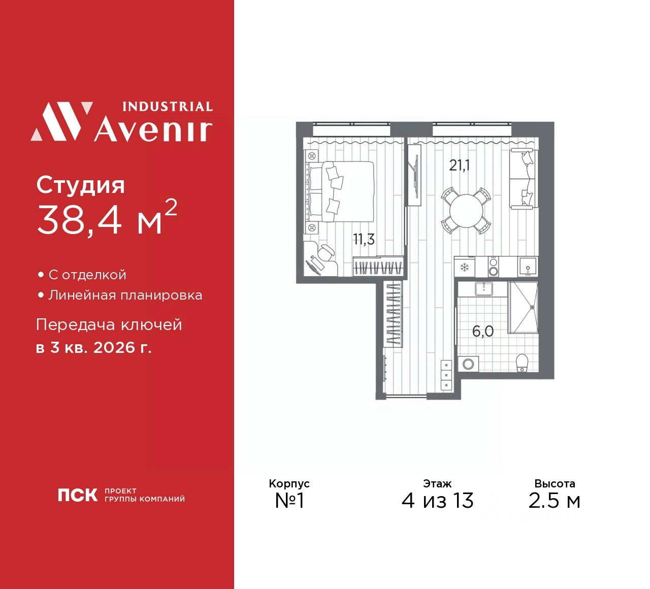 Продаются 2-комн. апартаменты с европланировкой и отделкой в ЖК "Industrial AVENIR" на 4 этаже. Общая площадь: 38.4 кв.м., жилая: 27.4 кв.м., общая площадь гостиной-столовой с кухонной зоной: 21.1 кв.м. Европланировка, кухня и гостиная объединены в одно просторное помещение. Комнаты изолированные, все окна выходят на одну сторону. В апартаментах один совмещенный санузел. Высота потолков 2.5 м.
