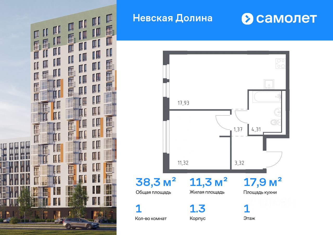 Строим кварталы для жизни с заботой о будущем. Предлагается 1-комнатная квартира комфорт-класса 38,25 кв.м в корпусе 1.3 на 1 этаже, в ЖК "Невская Долина"
