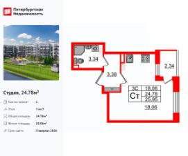 Удобная, классическая, функциональная европланировка, просторная прихожая 3.38 м². Общая площадь студии - 24.78 м², жилая 18.06 м², высота потолка 3.07 м.
