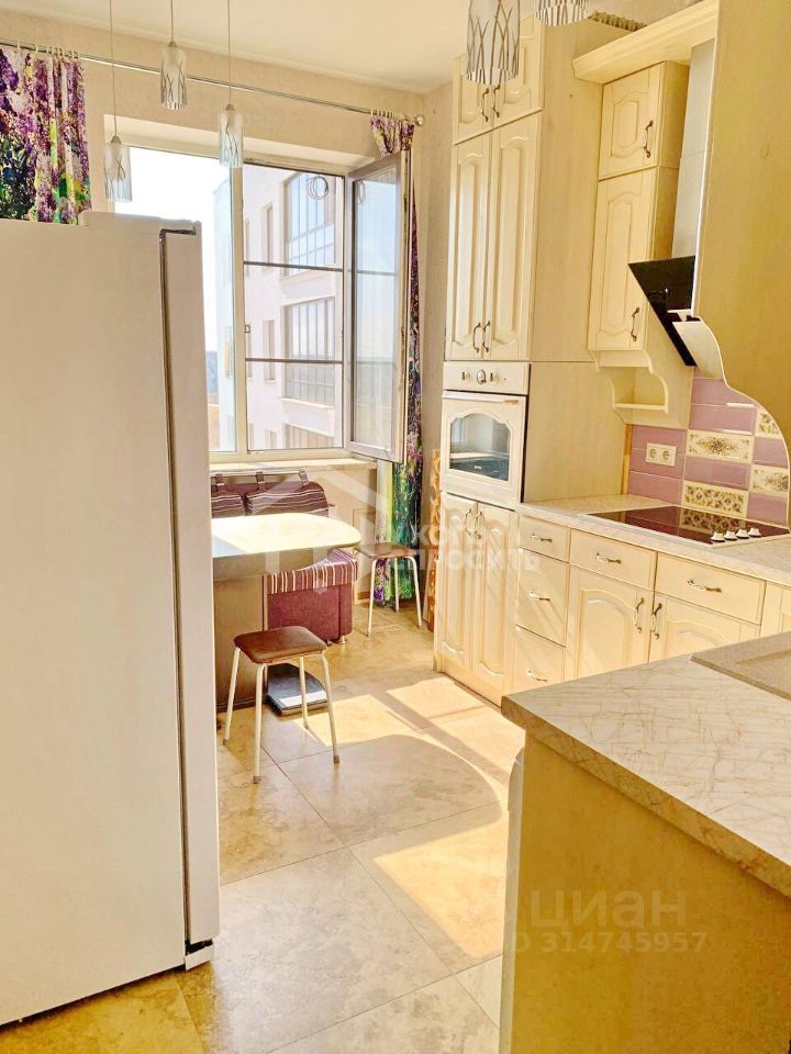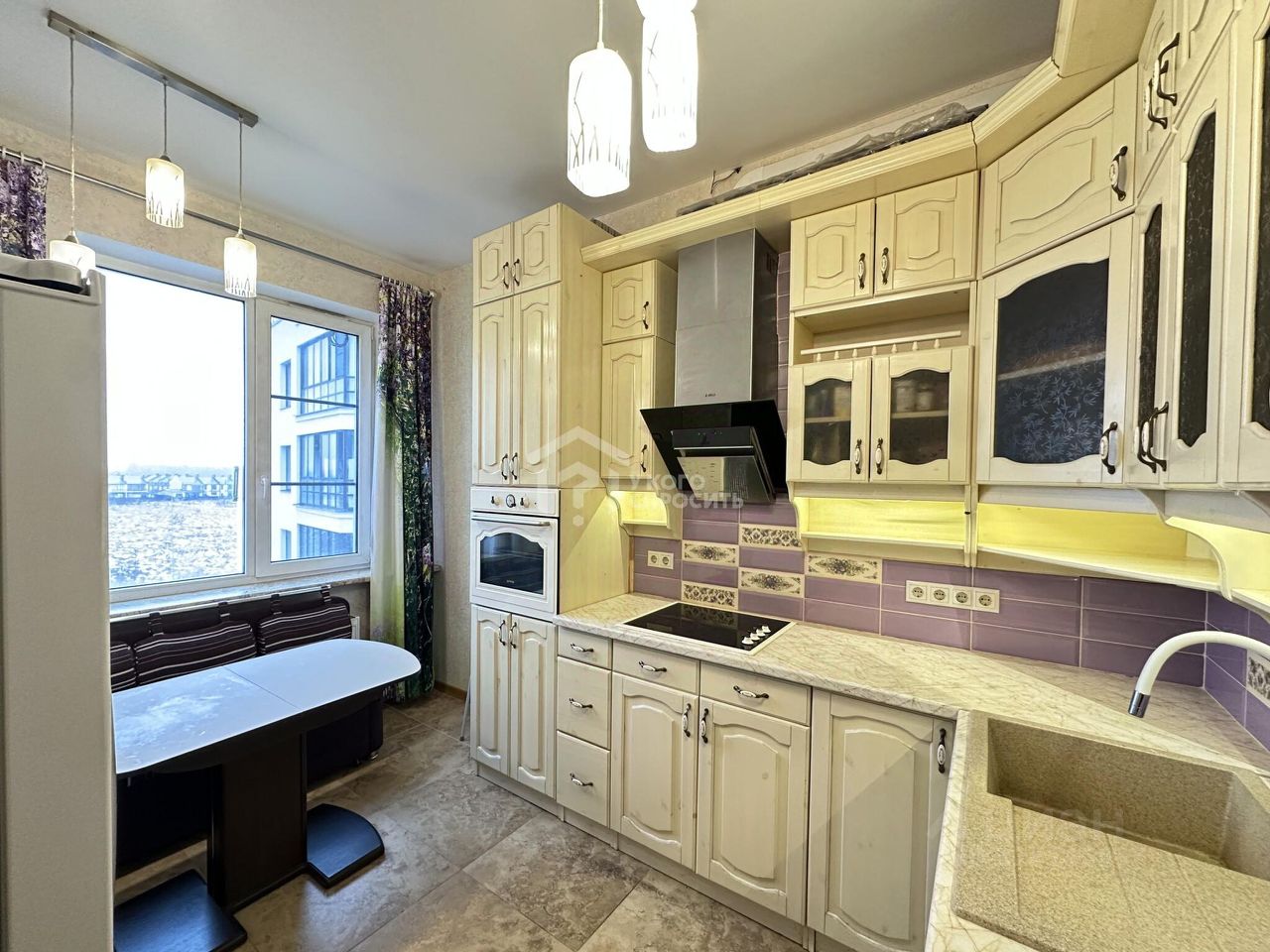 Просторная кухня выполнена из массива дерева в стиле Прованс, со встроенной духовкой и варочной поверхностью. Санузел оформлен керамической плиткой, системой фильтрации воды, подвесным шкафом с раковиной и вертикальной стиральной машиной. Полы кухни, прихожей и санузла в одном уровне выполнены плиткой с фактурой под камень. Потолки во всей квартире натяжные, матовые с фактурой под кожу.