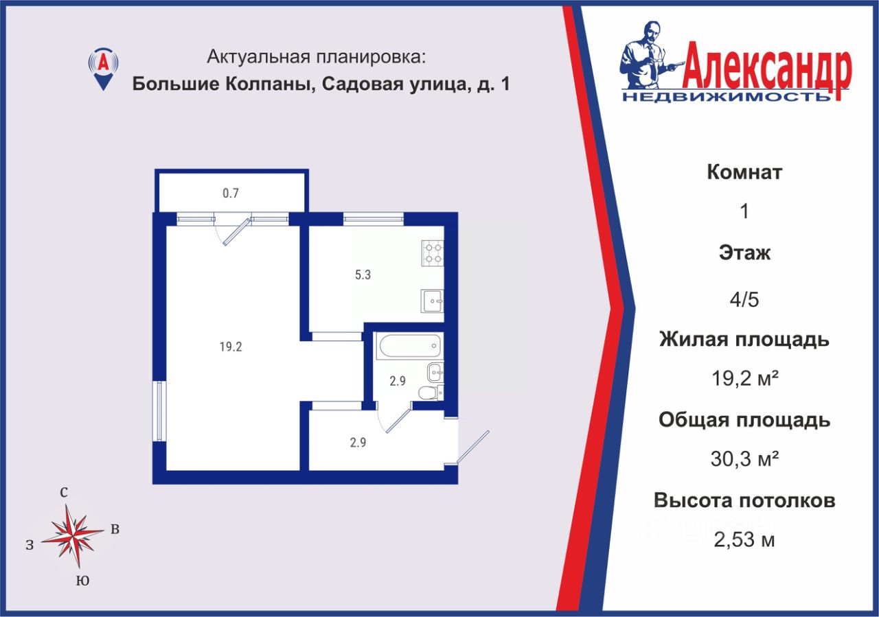 Общая площaдь сocтавляeт 30,3 м² плюс балкон 0,7 м², жилая площадь — 19,2 м².