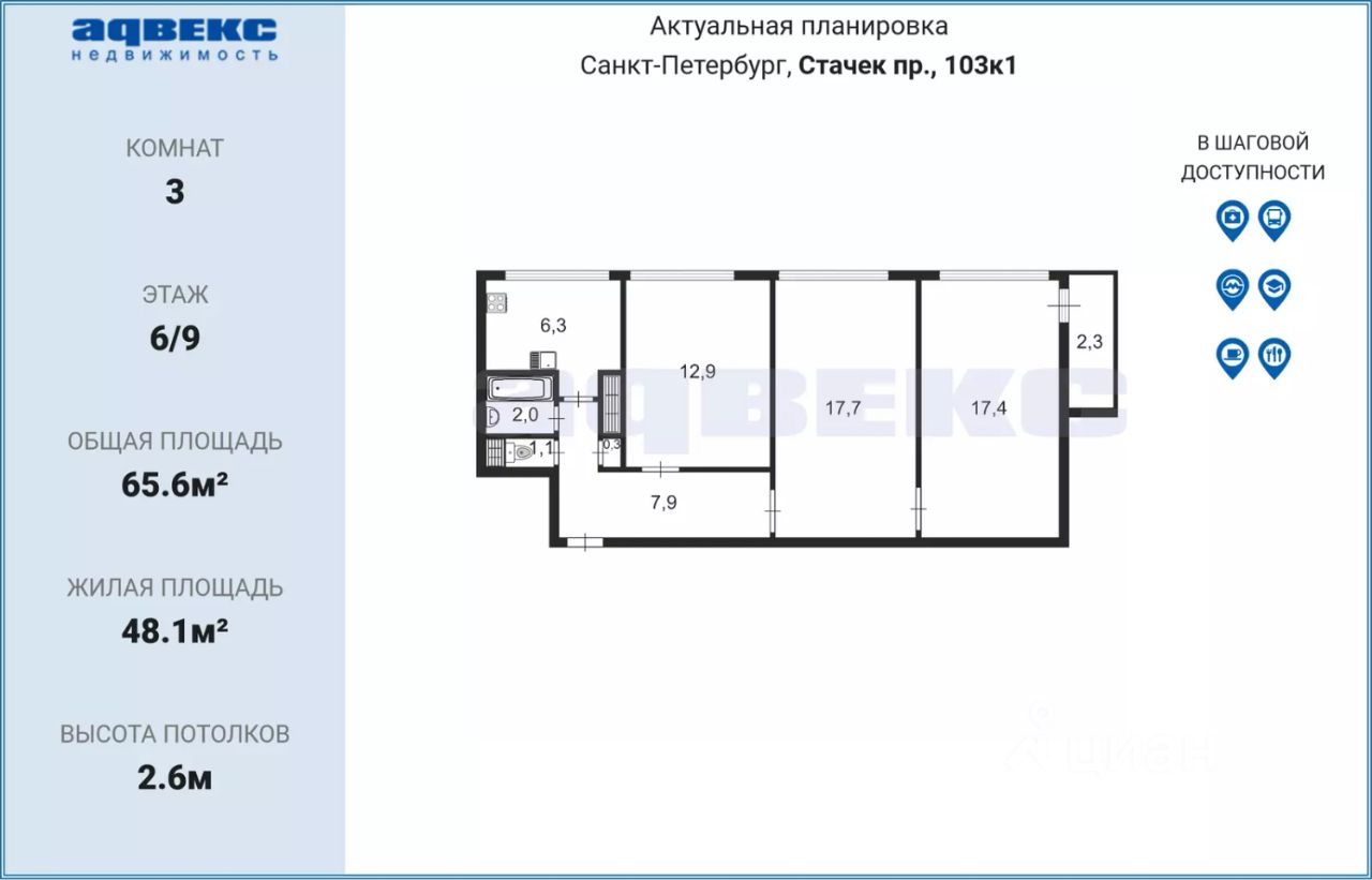общая 65.6, жилая 48.1, кухня 6.4, коридор 8, площади комнат 13+17.6+17.5, все комнаты изолированы, без перепланировок, застекленный балкон