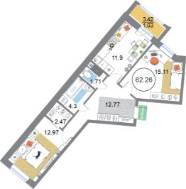 Продаётся 2 комнатная квартира в жилищном комплексе Modum (Корпус 3 секция 12). Общая площадь 62.26 кв. м, площадь комнат 12.97+15.11 кв.м. . Квартира расположена на 12 этаже 12 этажного дома. Сдается с отделкой White-box.