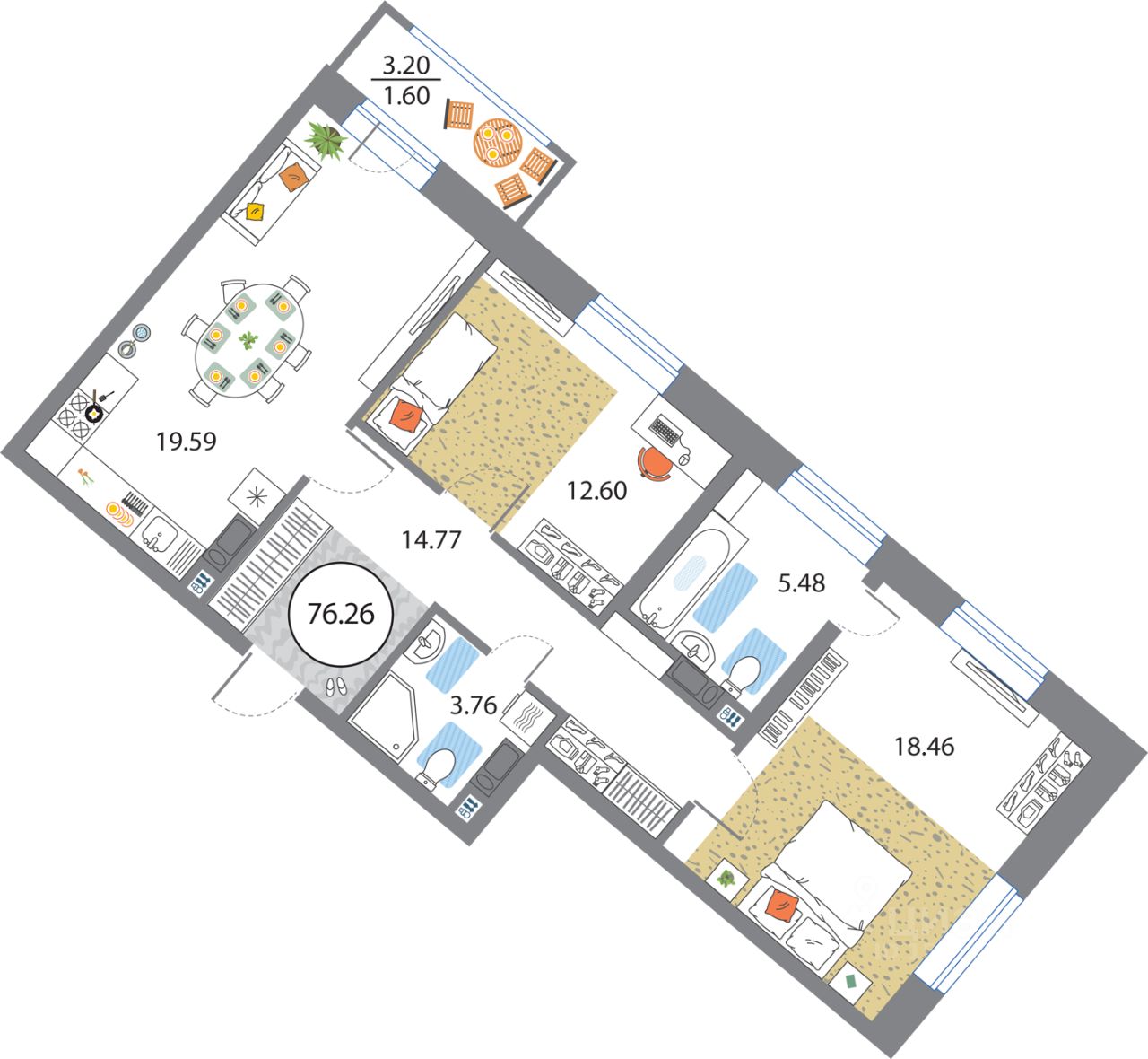 Продаётся e3 комнатная квартира (евро) в жилищном комплексе Modum (Корпус 2 секция 1). Общая площадь 76.26 кв. м, площадь комнат 12.6+18.46 кв.м. 2 санузла. Квартира расположена на 7 этаже 12 этажного дома. Сдается с отделкой White-box.