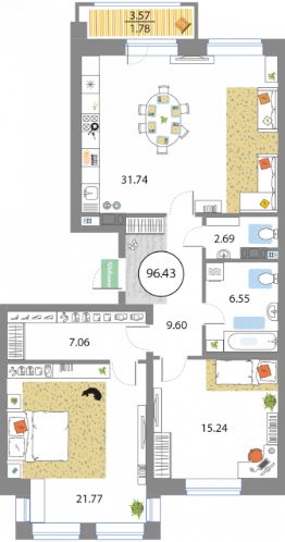 Продаётся e3 комнатная квартира (евро) в жилищном комплексе Modum (Корпус 2 секция 13). Общая площадь 96.43 кв. м, площадь комнат 21.77+15.24 кв.м. 2 санузла. Квартира расположена на 3 этаже 12 этажного дома. Сдается с отделкой White-box.