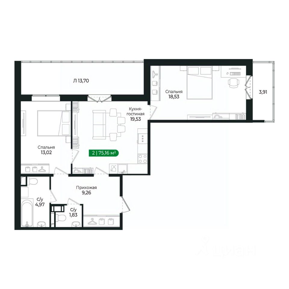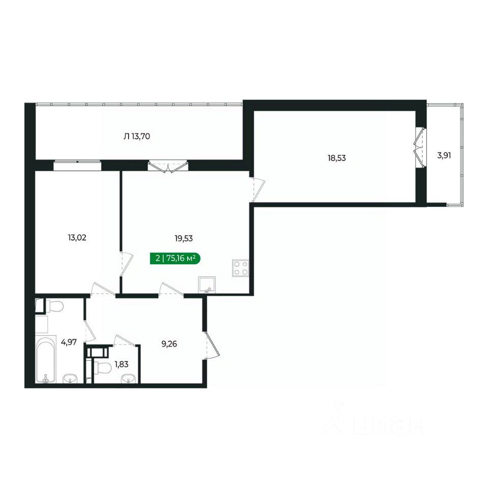 Напрямую продаётся уютная 2-комнатная квартира 232 общей площадью 75,16 м2 во II очереди в жилом комплексе Сертолово Парк от застройщика ГК Алгоритм.