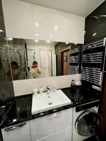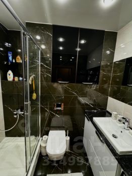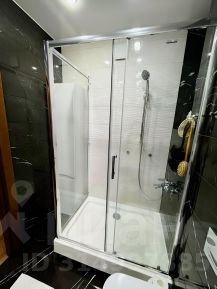 Ванная комната оснащена душевой кабиной, шкафами: навесной Am Pm и встроенный, с возможностью подключения внутри бойлера, инсталляция, стиральная машина, тумба для хранения мелочей, электрический полотенцесушитель.