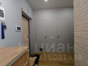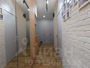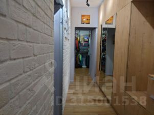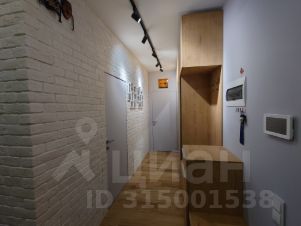 Одна стена прихожей оформлена в белом кирпиче. Вдоль другой стены расположен высокий шкаф-купе в древесных оттенках.