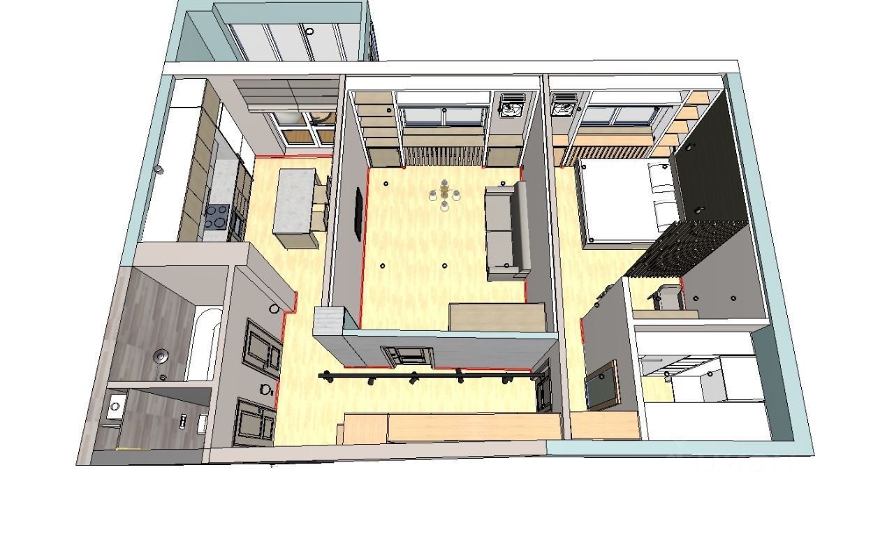 Большие двустворчатые полностью остекленные двери соединяют кухню с утепленной лоджией 5,1 м2 с полным панорамным остеклением, преобразуя получившееся общее пространство площадью 15,8 м2 в кухню-гостиную.